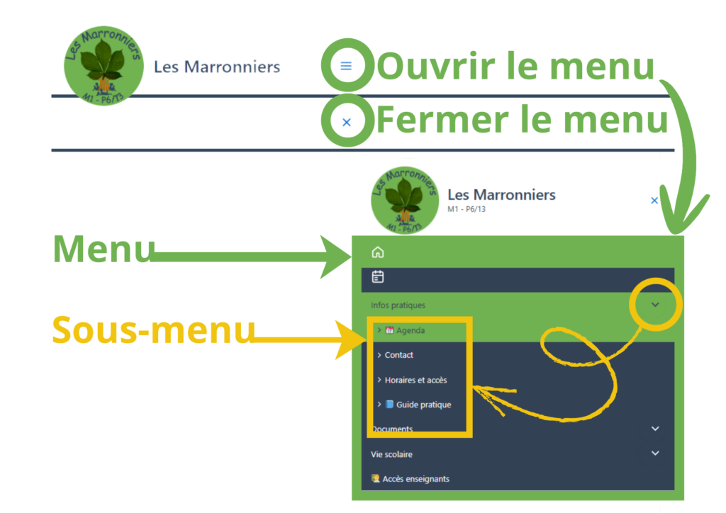 | 🖥️ Sur grand écran, le menu est directement accessible | 📱 Sur petit écran, il faut cliquer sur le bouton « ≡ » pour y accéder |